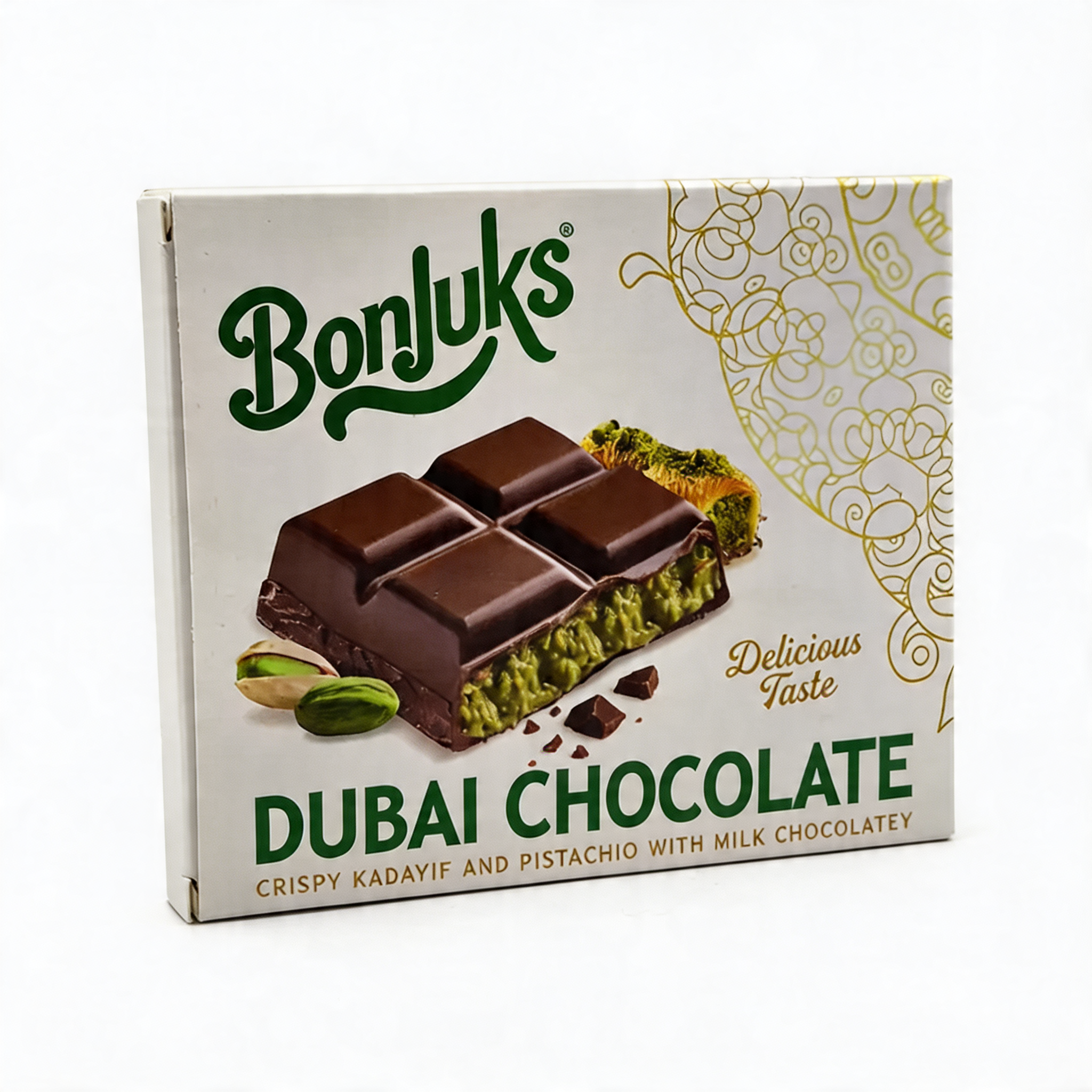 Bonjuks представляет вирусный хит - «Дубайский шоколад»! Нежный молочный шоколад скрывает внутри аппетитную хрустящую сердцевину из теста кадаиф и благородных фисташек. Это не просто сладость, а настоящее путешествие вкусов, где восточные ингредиенты встречаются с высоким кондитерским искусством